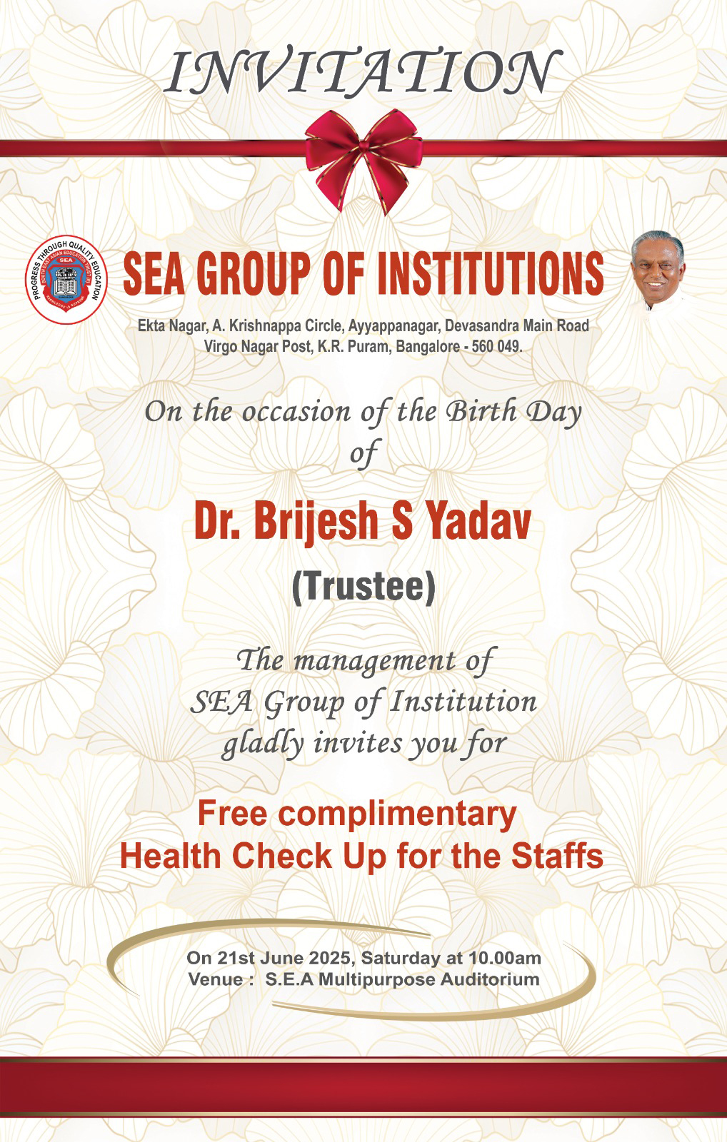 SEA College of Nursing Principal, faculties and students celebrated the Birthday of our beloved Trustee Dr. Brijesh S Yadav, SEA Group of Institutions, Bangalore. Respected Management organized a Free Health camp for all teaching and non-teaching faculties of SEA Group of Institutions on 21/06/25 at Multi-Purpose Auditorium.